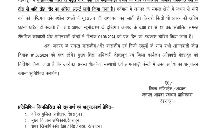 देहरादून, न्यूज यूके लाइव डॉट इन। मौसम विभाग द्वारा भारी बारिश के बाबत जारी पूर्वानुमानों को दृष्टिगत रखते हुए जिलाधिकारी ने 01 अगस्त को जनपद के समस्त स्कूलों व आंगनवाड़ी केंद्रों में अवकाश घोषित किया है। इस बाबत आदेश जारी कर दिए गए हैं।