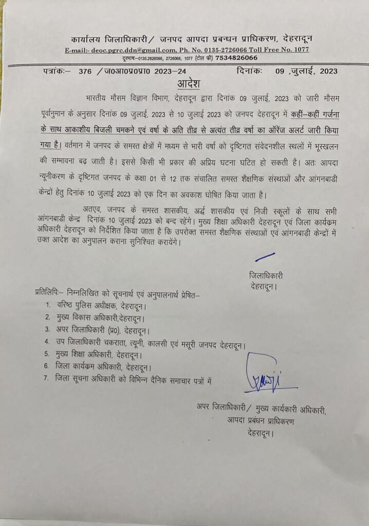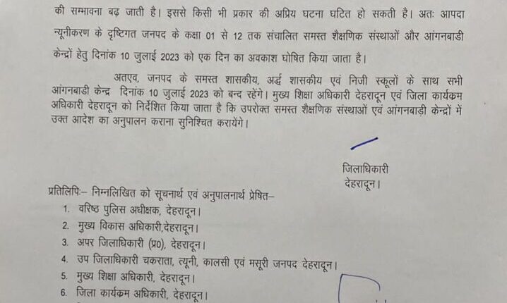 देहरादून 9 जुलाई, न्यूज़ यूके लाइव डॉट इन। मौसम विभाग द्वारा भारी वर्षा की चेतावनी के दृष्टिगत जिलाधिकारी श्रीमती सोनिका ने कल 10 जुलाई 2023 को जनपद के कक्षा 1 से कक्षा 12 तक के समस्त शासकीय, गैर शासकीय स्कूल, आंगनबाड़ी केंद्र बंद रखने के आदेश दिए हैं।