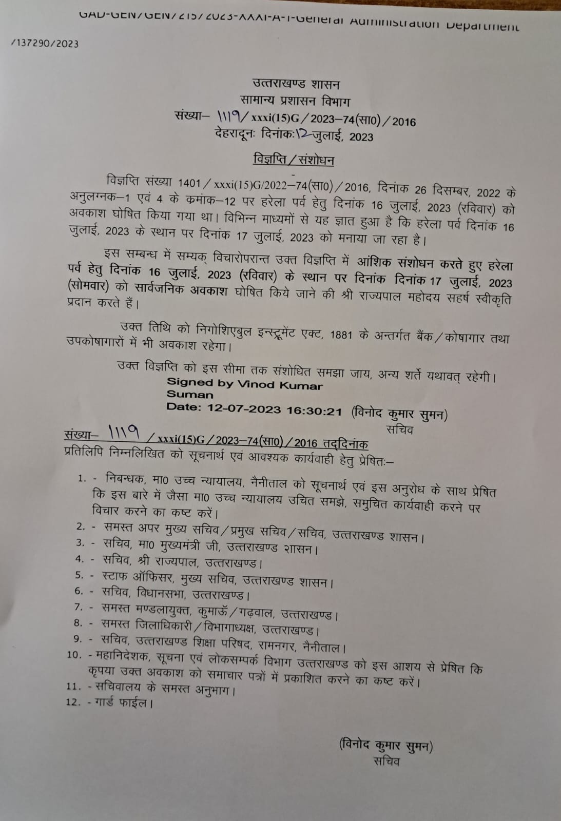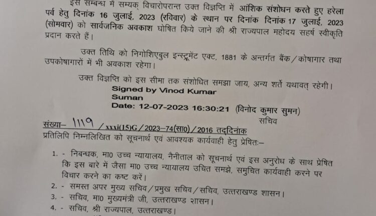 17 को रहेगा हरेला पर्व का अवकाश, आदेश जारी By newsadmin On Jul 12, 2023 देहरादून 12 जुलाई, न्यूज़ यूके लाइव डॉट इन। उत्तराखंड में 16 जुलाई (रविवार) के स्थान पर 17 जुलाई (सोमवार) को हरेला पर्व का अवकाश घोषित किया गया है। देखिए आदेश Facebook Twitter LinkedIn WhatsApp
