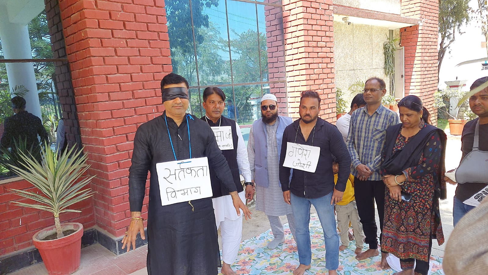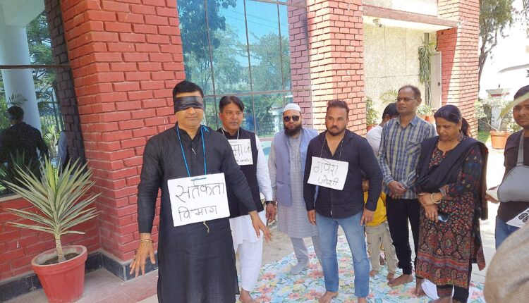 आँखों पर पट्टी बांध रविंद्र आनंद पहुंचे विजिलेंस विभाग, नाटकीय रूपांतरण कर विभाग को बताया अंधा