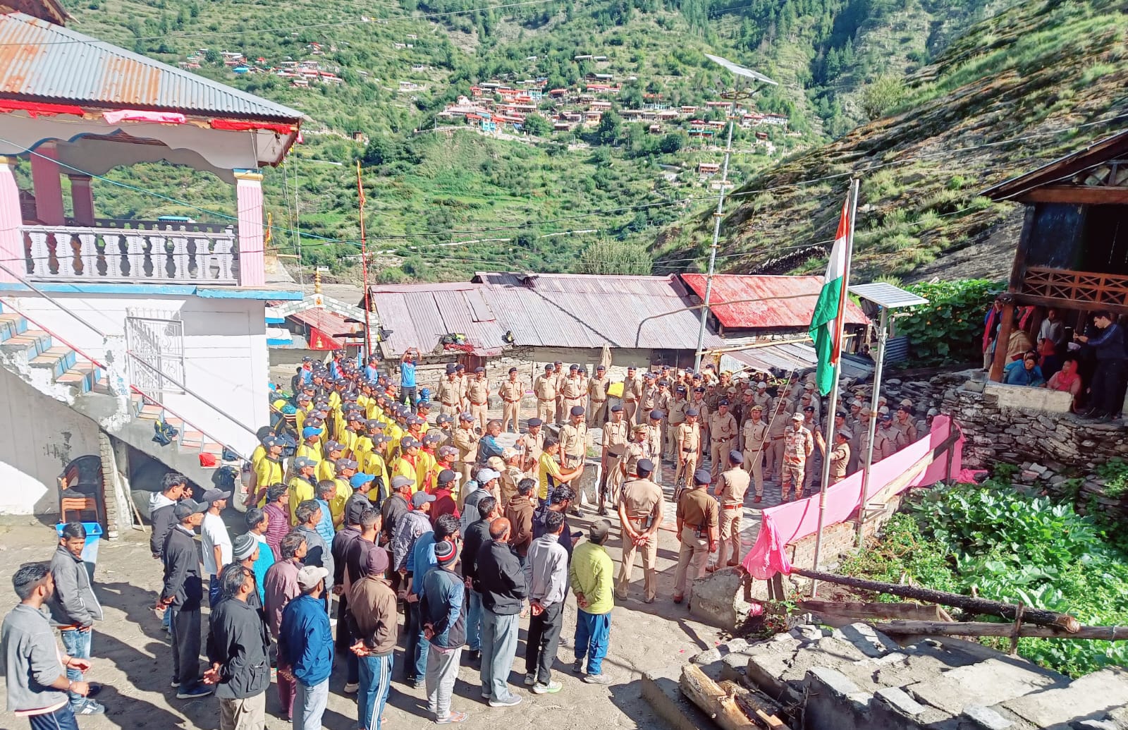 स्वतंत्रता दिवस पर आपदा प्रभावित धराली गाँव मे राहत एवं बचाव कार्यों में जुटे कर्मियों के साथ ग्रामीणों ने समेश्वर देवता मंदिर के प्रांगण में जुट कर ध्वजारोहण किया। धराली में एसडीआरएफ के आईजी अरुण मोहन जोशी ने ध्वजारोहण कर आपदा प्रभावितों को हर संभव सहायता का आश्वासन दिया।