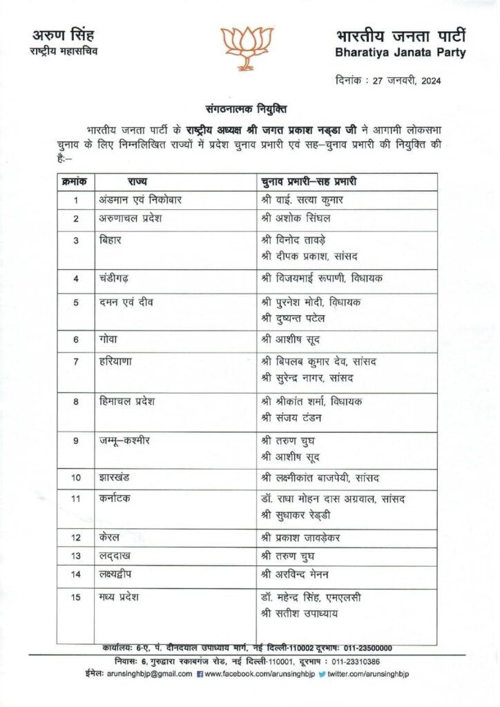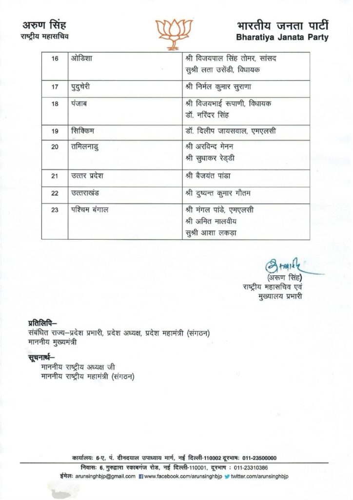 भारतीय जनता पार्टी के राष्ट्रीय महासचिव तथा मुख्यालय प्रभारी अरुण कुमार सिंह ने प्रदेश प्रभारी की सूची की है। जारी की गई सूची में 23 राज्यों के प्रभारी व सहप्रभारी के नामों का खुलासा किया गया है। जारी की गई सूची में उत्तराखंड में जहां एक बार फिर दुष्यंत कुमार गौतम को जिम्मेदारी दी गई है, वहीं बैजयंत पांडा को उत्तर प्रदेश का प्रभारी बनाया गया है।