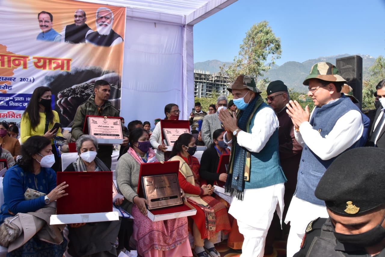 बीएसएनके न्यूज / देहरादून डेस्क। केंद्रीय रक्षा मंत्री राजनाथ सिंह और मुख्यमंत्री पुष्कर सिंह धामी ने बुधवार को गुनियाल गांव, देहरादून में लगभग 63 करोड़ रूपए की लागत से बने रहे भव्य सैन्य धाम का भूमि पूजन किया। इस अवसर पर शहीद सम्मान यात्रा का विधिवत समापन भी किया गया। रक्षा मंत्री राजनाथ सिंह एवं मुख्यमंत्री पुष्कर सिंह धामी द्वारा सैन्यधाम हेतु प्रदेश के प्रत्येक शहीद परिवार के आंगन से लाई गई पवित्र मिट्टी को कलश में डाला गया। साथ ही वीर शहीदों के परिजनों से मुलाकात कर तथा उन्हें शौर्य सम्मान पत्र प्रदान देकर सम्मानित भी किया गया।
