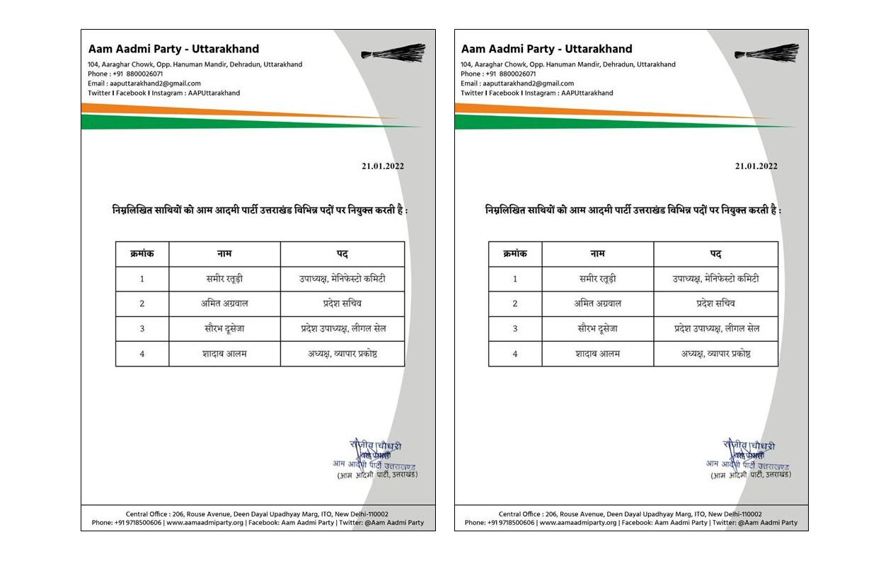 बीएसएनके न्यूज/ देहरादून डेस्क। आप पार्टी आने वाले चुनावों को लेकर काफी मजबूत नजर आ रही है। संगठन मजबूती से लेकर बूथ स्तर तक आप पार्टी बहुत ही गंभीरता से अपनी ताकत को बढाने का काम कर रही है। इसी कडी में आप पार्टी ने अपने अलग अलग प्रकोष्ठों में कुछ नए लोगों को नई जिम्मेदारियां दी हैं।