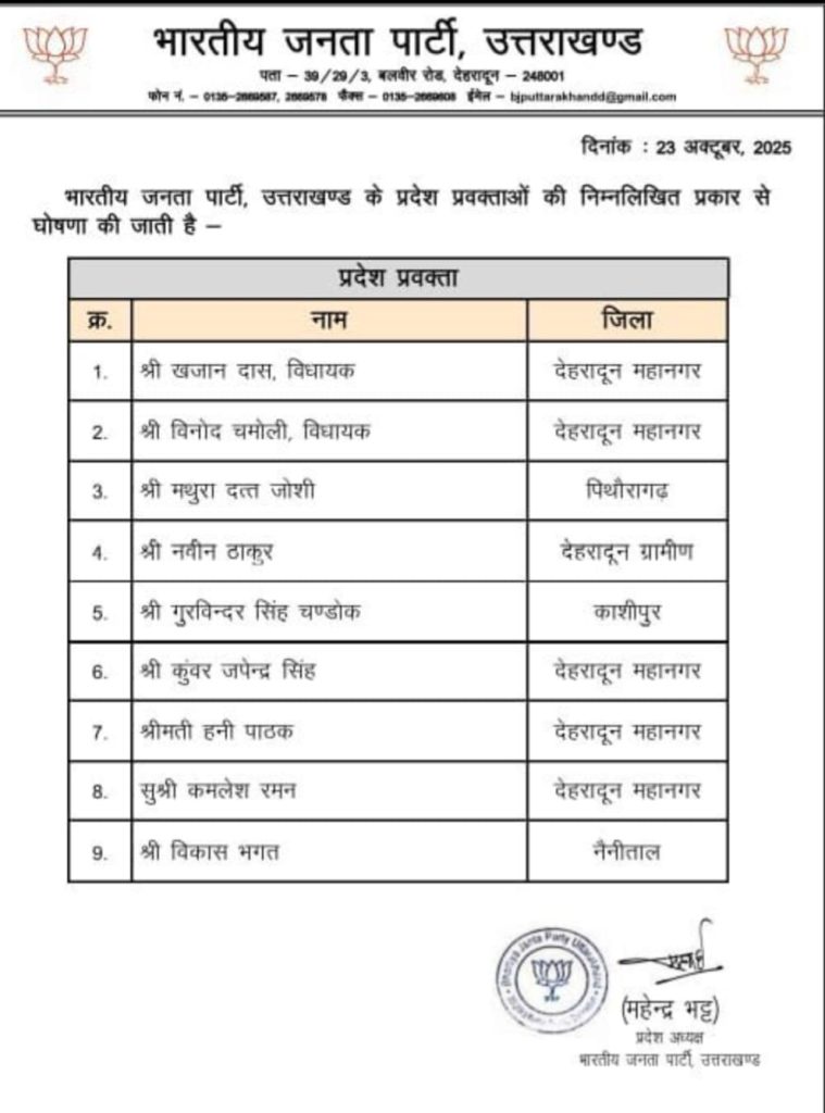 देहरादून, न्यूज यूके लाइव डॉट इन। भाजपा ने प्रदेश प्रवक्ताओं की घोषणा कर दी है।