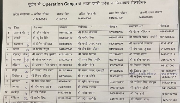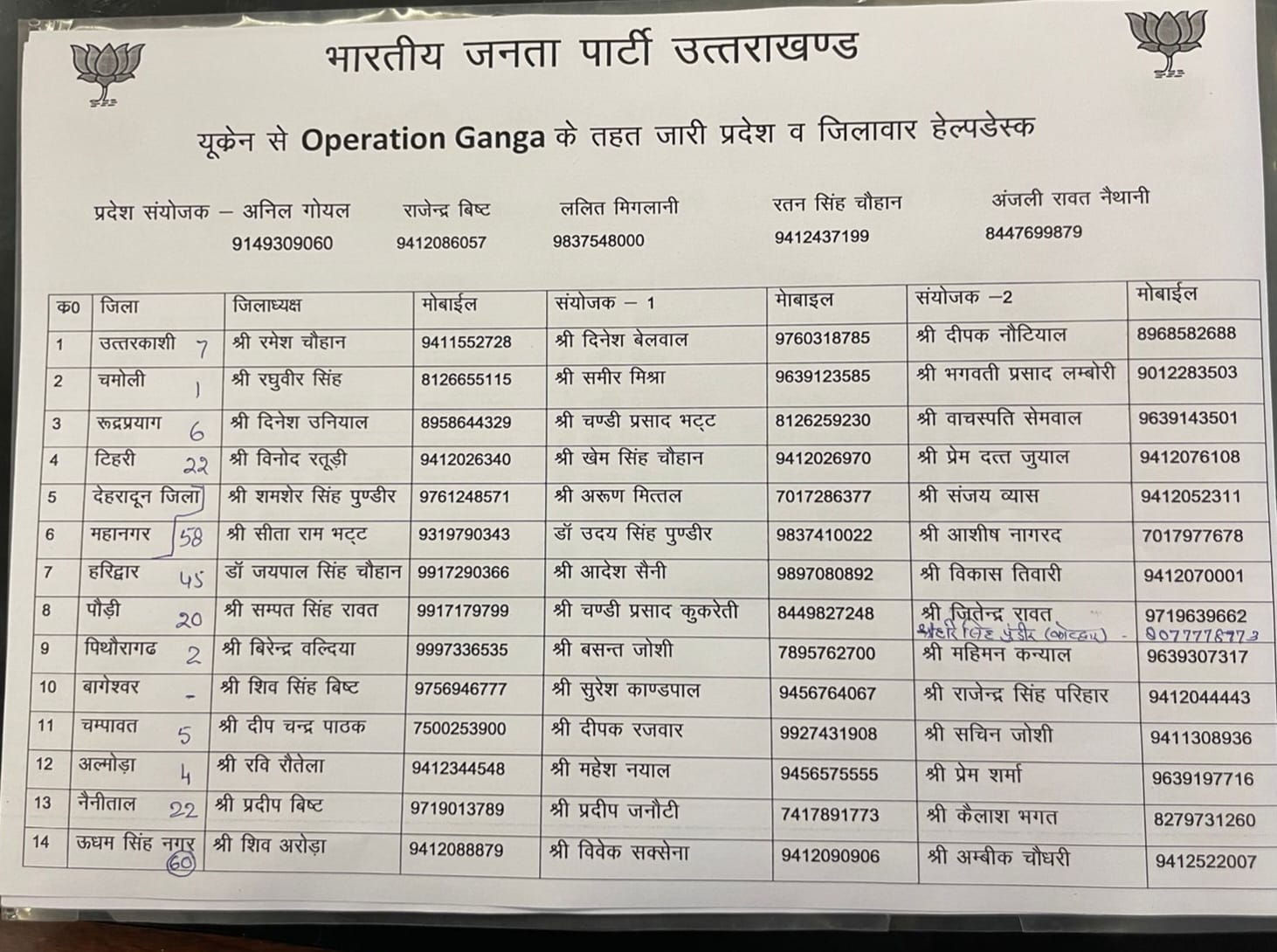 देहरादून, (न्यूज यूके लाइव डॉट इन)। यूक्रेन में फंसे लोगों को रेस्क्यू करने के लिए भारत सरकार द्वारा चलाये जा रहे ऑपरेशन गंगा के तहत अब राज्य के लोगो को मदद मुहैया कराने के लिए भाजपा ने भी प्रदेश और ज़िला स्तर पर हेल्प डेस्क बनाई है। प्रदेश मीडिया प्रभारी मनवीर सिंह चौहान ने बताया कि प्रदेश स्तर पर प्रदेश उपाध्यक्ष अनिल गोयल के संयोजन मे 5 लोगों की टीम दो गढ़वाल दो कुमाऊँ मंडल के पदाधिकारियों को शामिल किया गया है। वहीं ज़िला स्तर पर जिलध्यक्ष एवं दो अन्य पदाधिकारी शासन और छात्रो के परिजनों से मध्य सेतु का कार्य करेंगे।
