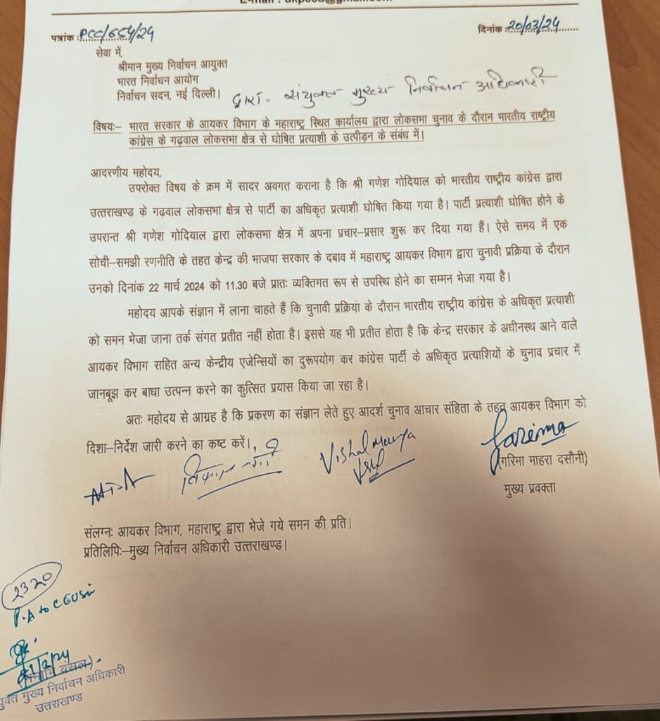 इस मौके पर प्रतिनिधिमंडल ने अखिल भारतीय राष्ट्रीय कांग्रेस के गढ़वाल संसदीय क्षेत्र से प्रत्याशी श्री गणेश गोदियाल के इनकम टैक्स विभाग ,महाराष्ट्र द्वारा सम्मन दिए जाने और उत्पीड़न करने की शिकायत करते हुए ज्ञापन सौंपा।