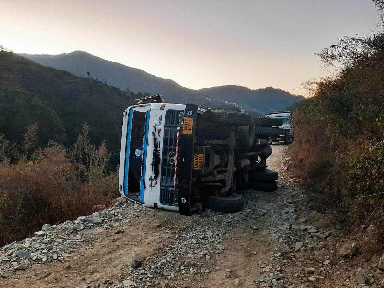 लोनिवि की खराब सड़क के कारण डंपर पलटा, खस्ताहाल सड़क दुर्घटनाओ को खुला निमंत्रण