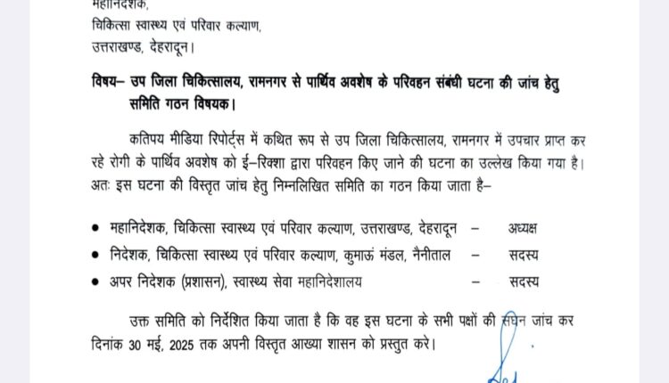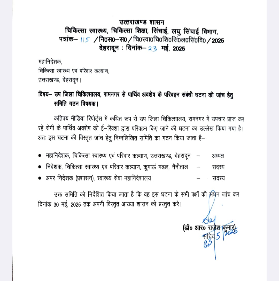 स्वास्थ्य सचिव ने नैनीताल के मुख्य चिकित्सा अधिकारी (CMO) और मुख्य चिकित्सा अधीक्षक, उप जिला चिकित्सालय, रामनगर से भी 26 मई तक विस्तृत आख्या प्रस्तुत करने को कहा है। उन्होंने यह भी स्पष्ट किया कि जांच में यह तथ्य सामने लाया जाए कि उप जिला चिकित्सालय में शव वाहन या एंबुलेंस की सुविधा उपलब्ध क्यों नहीं थी।