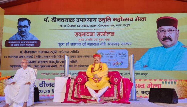 उक्त बात प्रदेश के पर्यटन, लोक निर्माण, सिंचाई, पंचायतीराज, ग्रामीण निर्माण, जलागम, धर्मस्व एवं संस्कृति मंत्री सतपाल महाराज ने रविवार को उत्तर प्रदेश के मथुरा, फरह के दीनदयाल धाम में आयोजित पंडित दीनदयाल उपाध्याय स्मृति महोत्सव मेले के शुभारंभ अवसर पर बतौर मुख्य अतिथि अपने संबोधन में कही। एकात्म मानववाद दर्शन के प्रणेता पंडित दीनदयाल उपाध्याय के जन्मोत्सव पर 29 सितम्बर से 02 अक्टूबर 2024 तक चलने वाले इस स्मृति महोत्सव मेले में पंडित दीनदयाल उपाध्याय स्मृति महोत्सव समिति और पंडित दीनदयाल उपाध्याय जन्मभूमि स्मारक समिति द्वारा विशाल मेला एवं ग्रामीण विकास प्रदर्शनी के साथ-साथ लोक-कला, लोक संस्कृति, पर्यावरण संरक्षण, भूमि संरक्षण, गौ सेवा, महिला सशक्तिकरण और “पुरातन सामर्थ्य के साथ-साथ नया भारत” जैसे विषय पर गोष्ठी एवं विभिन्न कार्यक्रम आयोजित किए जा रहे हैं।
