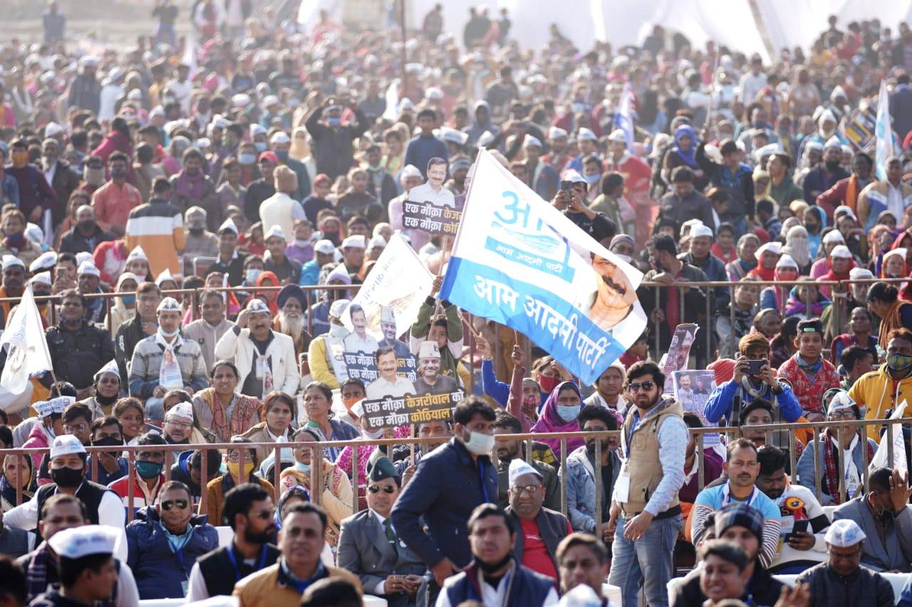 मंच पर पहुंचते ही केजरीवाल का सभा में मौजूद हजारों लोगों ने हाथ उठा कर किया अभिवादन