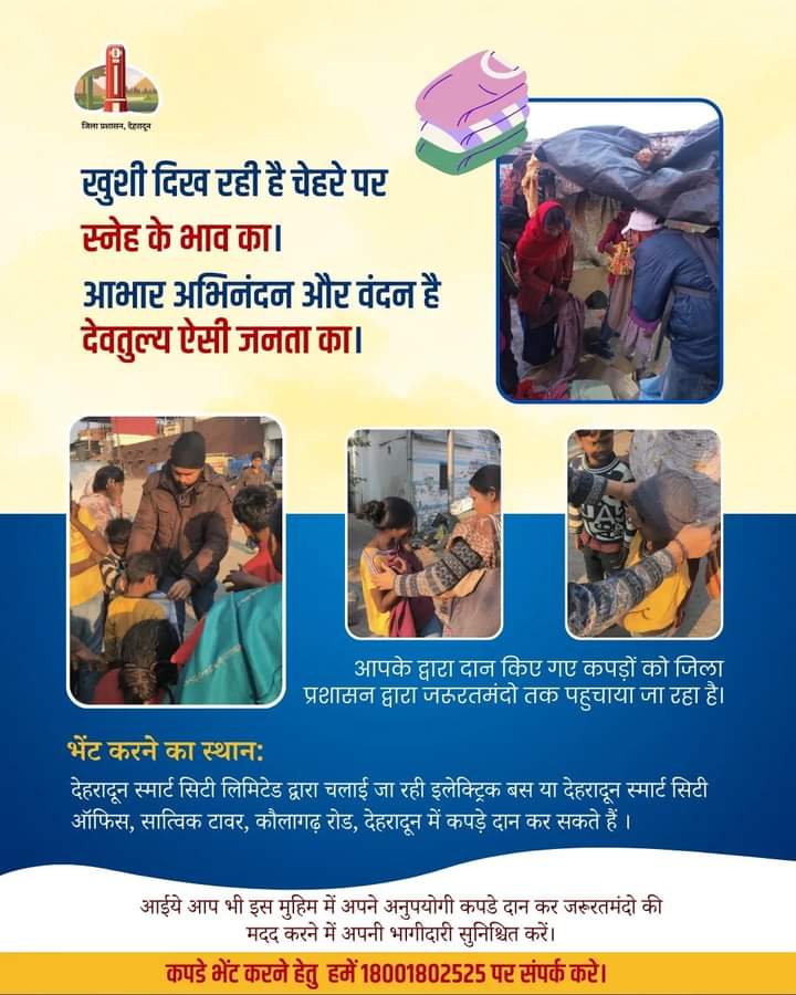 जिलाधिकारी ने कहा कि गरम कपड़े भेंट करने के लिए 18001802525 पर संपर्क कर अपना पता बताएं और टीम दिए गए पते पर पंहुचकर कपड़े प्राप्त करेंगी। या स्वयं भी देहरादून स्मार्ट सिटी लिमिटेड द्वारा चलाई जा रही इलेक्ट्रिक बस या देहरादून स्मार्ट सिटी ऑफिस, सात्विक टावर, कौलागढ़ रोड, देहरादून में कपड़े भेंट कर सकते हैं। उन्होंने समस्त जनपदवासियों से अनुरोध किया कि अपने अनुपयोगी गर्म कपड़े जरूरतमदों के लिए भेंटकर जिला प्रशासन का सहयोग करें।