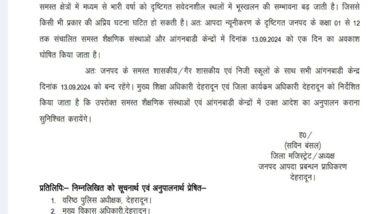देहरादून, न्यूज यूके लाइव डॉट इन। मौसम विभाग द्वारा भारी बारिश के बाबत जारी पूर्वानुमानों को दृष्टिगत रखते हुए जिलाधिकारी ने 13 सितंबर को जनपद के समस्त स्कूलों व आंगनवाड़ी केंद्रों में अवकाश घोषित किया है। इस बाबत आदेश जारी कर दिए गए हैं।