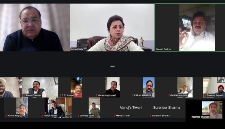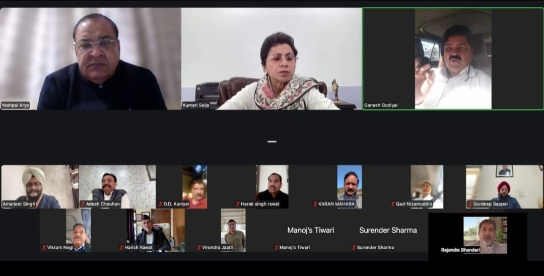 उत्तराखंड प्रदेश कांग्रेस कमेटी द्वारा चलाये जा रहे मनरेगा बचाओ संग्राम कार्यक्रम की समीक्षा हेतु प्रदेश प्रभारी कुमारी सैलजा की अध्यक्षता में वरिष्ठ कांग्रेस नेताओं की एक जूम बैठक का आयोजन किया गया। बैठक में प्रदेश प्रभारी कुमारी सैलजा, प्रदेश अध्यक्ष गणेश गोदियाल, नेता प्रतिपक्ष यशपाल आर्य, सहप्रभारी सुरेन्द्र शर्मा, पूर्व मुख्यमंत्री हरीश रावत, सीडब्लूसी सदस्य गुरदीप सप्पल, सीडब्लूसी सदस्य एवं पूर्व प्रदेश अध्यक्ष करन माहरा, एआईसीसी सचिव काजी निजामुद्दीन, चुनाव प्रबन्धन समिति के अध्यक्ष डॉ0 हरक सिंह रावत, मनरेगा समन्वय समिति के सदस्य एवं विधायक विक्रम सिंह नेगी, मनोज तिवारी, आदेश चौहान, विरेन्द्र जाति, देवीदत्त कुनियाल, प्रदेश महामंत्री राजेन्द्र सिंह भंडारी एवं सोशल मीडिया के अमरजीत सिंह ने प्रतिभाग किया।