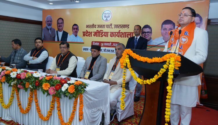 जीएमएस रोड़ स्थित होटल में आयोजित मीडिया टीम कार्यशाला में प्रतिभागियों का आह्वाहन करते हुए मुख्यमंत्री श्री पुष्कर धामी ने कहा, पीएम मोदी के मार्गदर्शन में हमने कठोर नकल कानून, सख्त धर्मांतरण कानून, अवैध धार्मिक अतिक्रमण पर कार्यवाही, मातृ शक्ति को 30 फीसदी आरक्षण जैसे अनेकों ऐतिहासिक कदम उठाए हैं । अब सरकार को यूसीसी का वो ड्राफ्ट मिलने जा रहा है जिसे लागू करने के लिए देवतुल्य जनता ने हमे अपना आशीर्वाद दिया था । आप सबको राज्य और केंद्र के ऐसे तमाम प्रयासों को जनता के मध्य अधिक से अधिक प्रसारित करना है । साथ ही यूसीसी के मुद्दे की विस्तृत जानकारी सभी माध्यमों से देनी है, साथ ही पर विपक्ष द्वारा फैलाई जा रही भ्रांति को भी दूर करना है । हम सभी सौभाग्यशाली हैं कि प्रभु श्री राम अपने मंदिर में पधारे हैं और लगभग 15 हजार वर्षों के बाद आज राम युग का आनंद ले रहे हैं । 5 लाख से अधिक युवाओं ने ईमानदार और पारदर्शी प्रक्रिया के तहत परीक्षाओं में सहभागिता की है ।