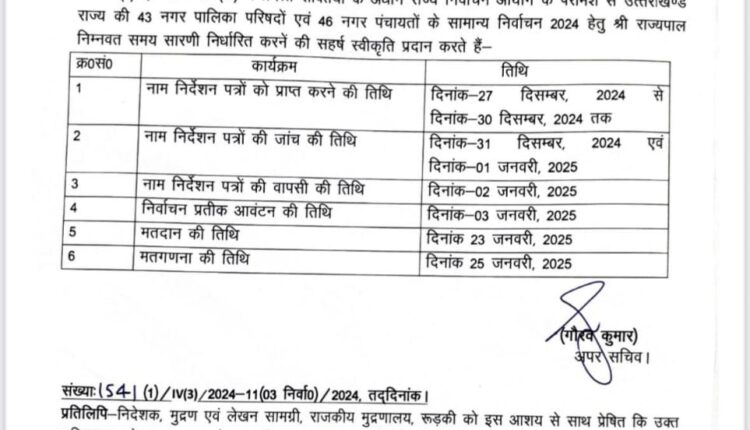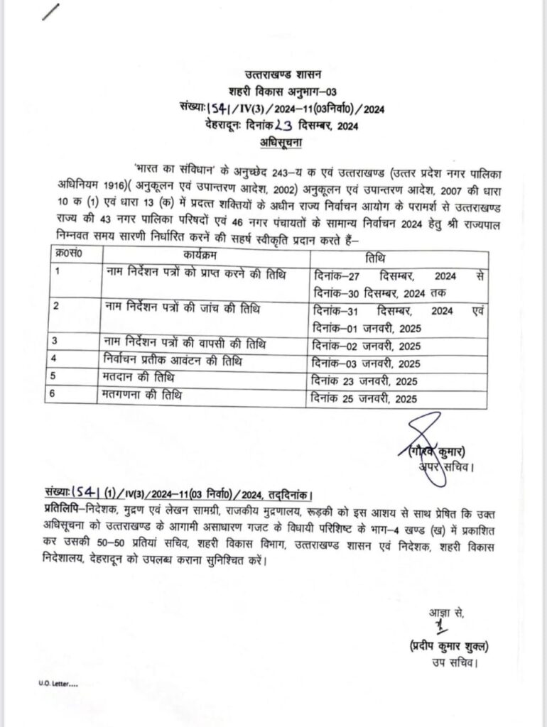 निकाय चुनाव को लेकर जारी की गई अधिसूचना By newsadmin On Dec 23, 2024 देहरादून, न्यूज यूके लाइव डॉट इन। निकाय चुनावों को लेकर अधिसूचना को जारी कर दिया गया है। आप भी जानिए क्या है चुनावी कार्यक्रम Facebook Twitter LinkedIn WhatsApp