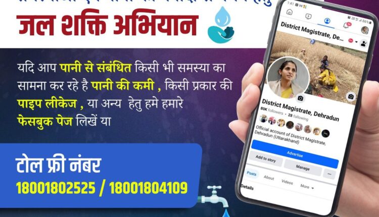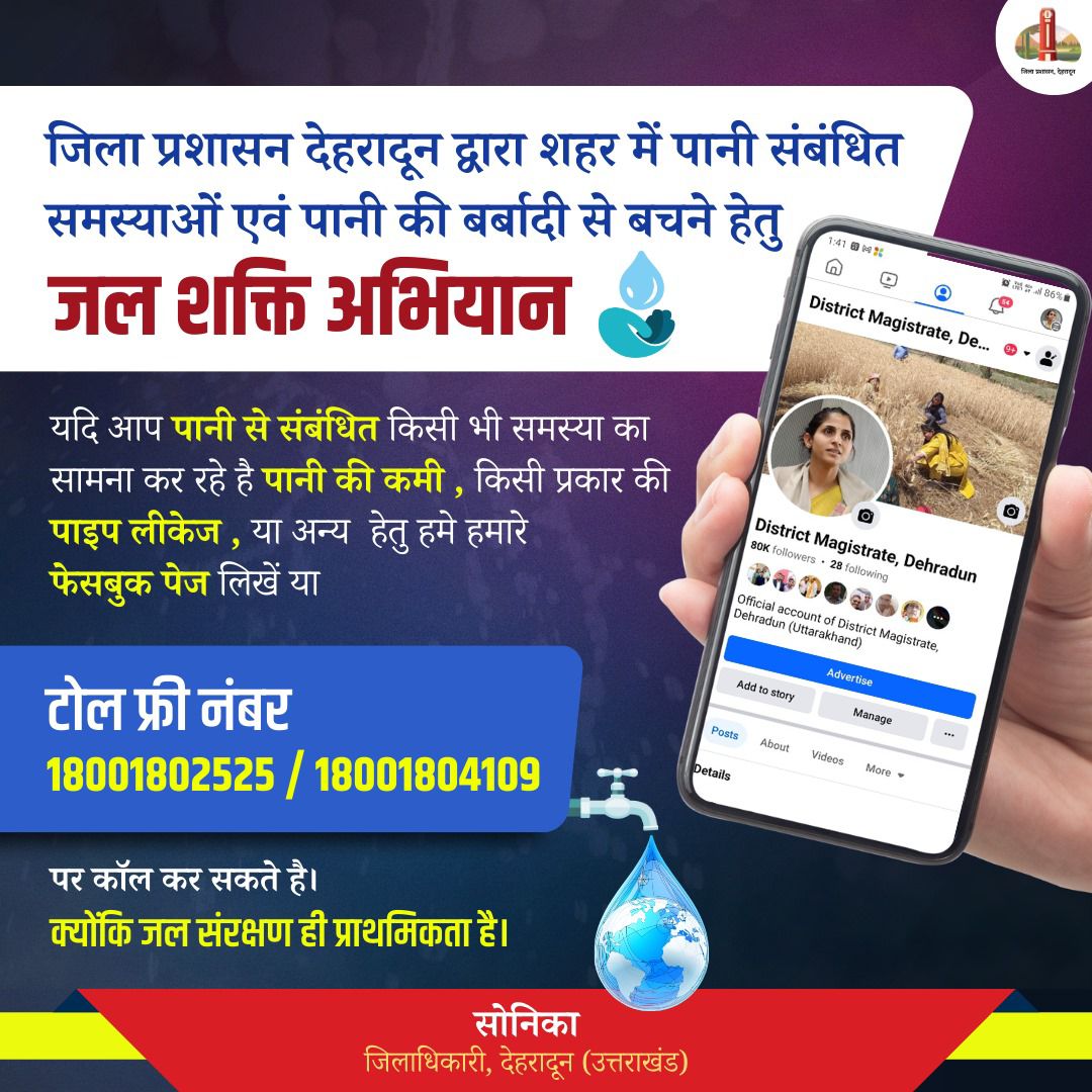जनपद में पेयजल समस्या के निराकरण एवं पानी की बर्बादी पानी से संबंधित किसी भी समस्या, पानी की कमी, पाईपलाइन लीकेज़ या पानी से संबंधित अन्य शिकायतों के लिए जिलाधिकारी देहरादून के फेसबुक पेज या टोल फ्री नं0 18001802525/18001804109 पर कॉल की जा सकती है ।
