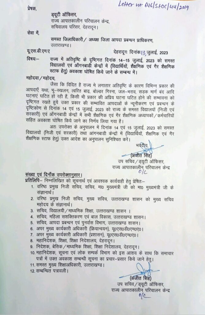 जारी आदेशों में कहा गया है कि लगातार अतिवृष्टि के कारण विभिन्न प्रकार की आपदाएं घटित हो रही हैं, किसी भी प्रकार की अप्रिय घटना घटित होने की सम्भावना को दृष्टिगत रखते हुये उक्त प्रकार की सम्भावित आपदाओं के न्यूनीकरण एवं प्रबन्धन के दृष्टिकोण से 14 एवं 15 जुलाई, 2023 को राज्य के समस्त विद्यालयों (निजी एवं सरकारी) एवं आँगनबाडी केन्द्रों में सभी शैक्षणिक एवं गैर शैक्षणिक अध्यापकों / कर्मचारियों सहित अवकाश घोषित किये जाने का निर्णय लिया गया है।