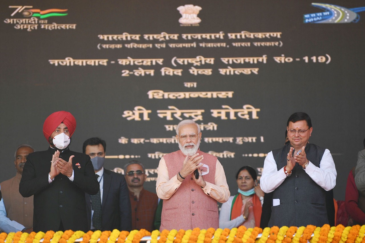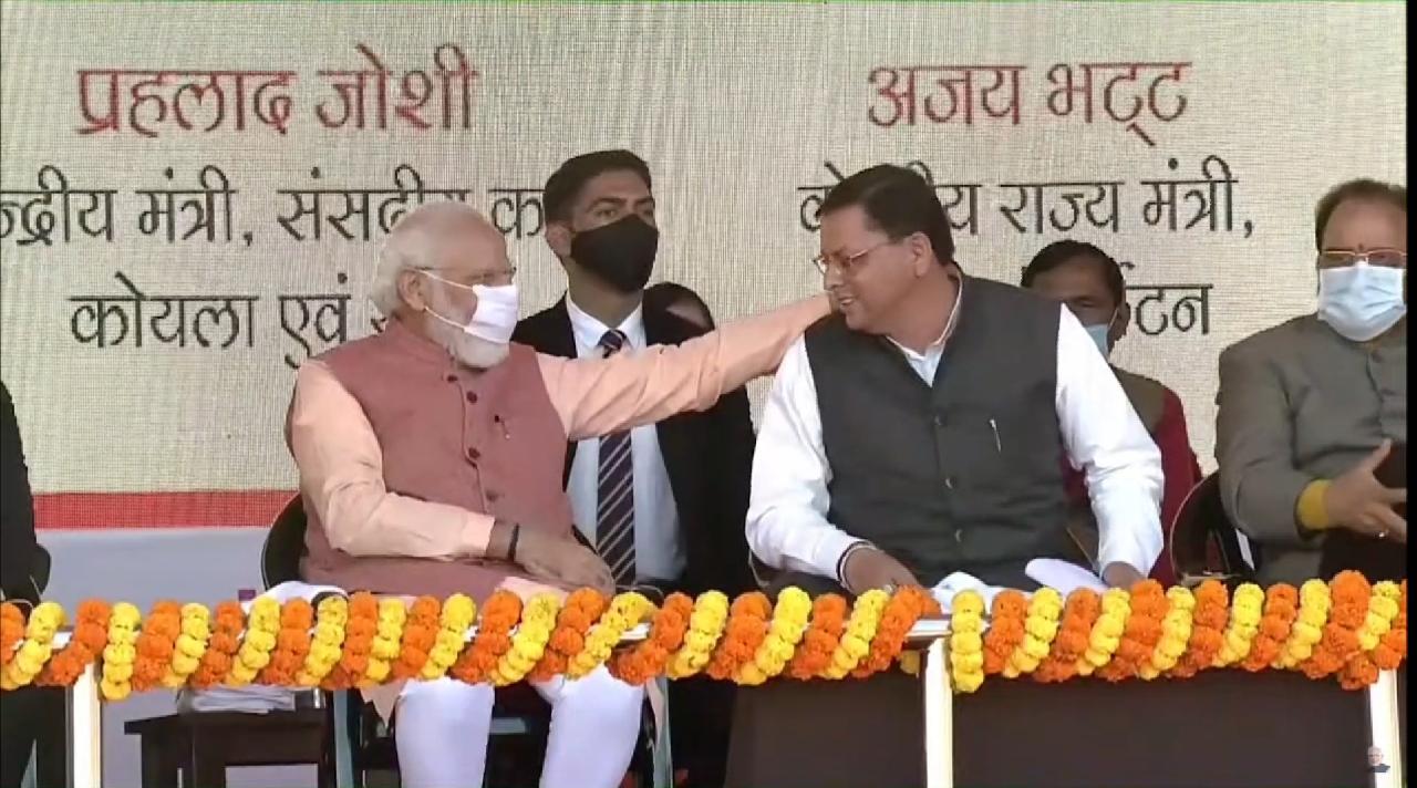 प्रधानमंत्री नरेन्द्र मोदी ने पुष्कर सिंह धामी को युवा, लोकप्रिय और ऊर्जावान मुख्यमंत्री बताते हुए कहा कि उनके नेतृत्व में उत्तराखण्ड के विकास का हर संकल्प पूरा होगा। राज्य में युवा नेतृत्व के साथ वरिष्ठ नेताओं की अनुभवी टीम है। उन्होंने कहा कि 2025 में उत्तराखण्ड अपने रजत जयंती वर्ष में विकास के नये आयाम प्राप्त करेगा। कोविड-19 के टीकाकरण अभियान में उत्तराखण्ड का देश के अग्रणी राज्यों में शामिल होने पर भी उन्होने मुख्यमंत्री पुष्कर सिंह धाम को बधाई दी। इससे पूर्व प्रधानमंत्री ने एन.एच.ए.आई. द्वारा संचालित योजनाओं के साथ ही अन्य योजनाओं पर आधारित प्रदर्शनी का भी अवलोकन किया। प्रधानमंत्री नरेन्द्र मोदी द्वारा अपने प्रारम्भिक संबोधन में प्रदेशवासियों का गढ़वाली में आभार व्यक्त करने तथा सम्बोधन के अंत में देवभूमि उत्तराखण्ड के महत्व पर आधारित कविता ‘‘जहाँ पावन बहे संकल्प लिए जहाँ पर्वत गर्व सिखाते हैं….से किया। जिसे जनता द्वारा काफी सराहा गया।