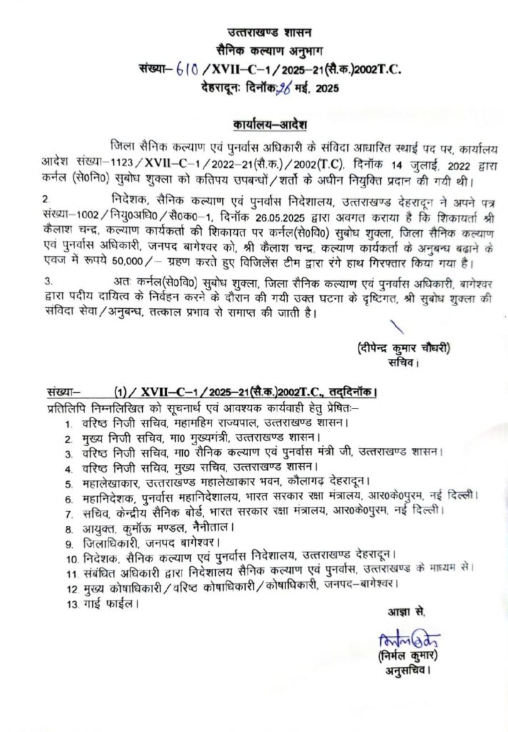 रिश्वत प्रकरण: बागेश्वर के जिला सैनिक कल्याण अधिकारी कों किया गया बर्खास्त, आदेश जारी
