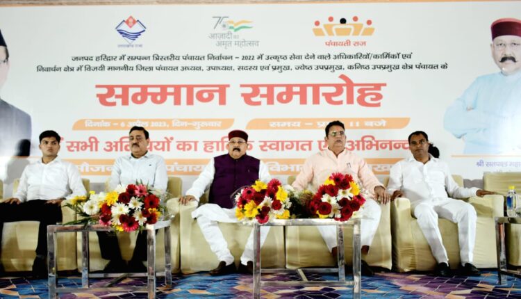 हरिद्वार 06 अप्रैल, न्यूज़ यूके लाइव डॉट इन। प्रदेश के पंचायती राज, लोक निर्माण, पर्यटन, सिंचाई, लघु सिंचाई, ग्रामीण निर्माण, संस्कृति एवं जलागम प्रबन्धन मंत्री सतपाल महाराज ने बृहस्पतिवार को प्रेमनगर आश्रम में पंचायती राज विभाग द्वारा आयोजित जनपद हरिद्वार में सम्पन्न त्रि-स्तरीय पंचायत चुनाव-2022 में उत्कृष्ट सेवा देने वाले अधिकारियों/कार्मिकों एवं चुनाव में विजयी जिला पंचायत अध्यक्ष, उपाध्यक्ष, सदस्य एवं प्रमुख, ज्येष्ठ प्रमुख, कनिष्ठ प्रमुख क्षेत्र पंचायत को सम्मानित किया।