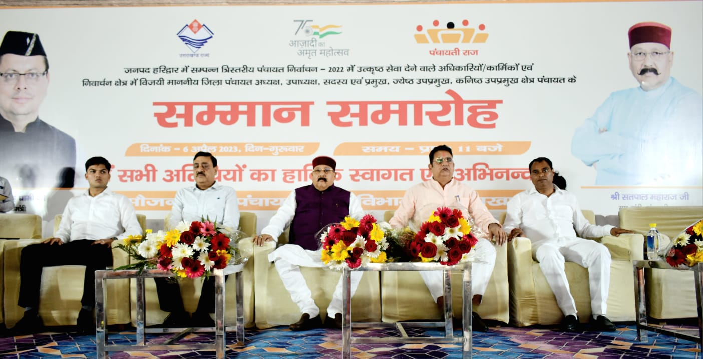 कार्यक्रम को सम्बोधित करते हुये पंचायत मंत्री कैबिनेट मंत्री सतपाल महाराज ने जनपद हरिद्वार में त्रि-स्तरीय पंचायत चुनाव-2022 को निर्विघ्न सम्पन्न कराने एवं इसमें उत्कृष्ट सेवा देने वाले अधिकारियों/कार्मिकों एवं चुनाव में विजयी जिला पंचायत अध्यक्ष, उपाध्यक्ष, सदस्य एवं प्रमुख, ज्येष्ठ प्रमुख, कनिष्ठ प्रमुख क्षेत्र पंचायत को बधाई एवं शुभकामनायें देने के साथ ही प्रसन्नता व्यक्त करते हुये कहा कि मेरा हमेशा यह विचार रहा है कि जो भी जिस किसी भी क्षेत्र में अच्छा कार्य करते हैं, उन्हें उनके उत्साहवर्द्धन हेतु पुरस्कृत अवश्य किया जाना चाहिये। उन्होंने कहा कि भारत में लोकतंत्र की जड़ें काफी गहरी हैं तथा हमारी सरकार निरन्तर पंचायतों को मजबूती प्रदान कर रही है, जिसमें सभी का सहयोग अपेक्षित है एवं अन्तिम छोर पर जो व्यक्ति खड़ा है, उसके कल्याण के लिये हम कृत संकल्प हैं।