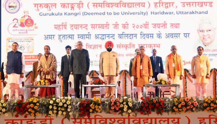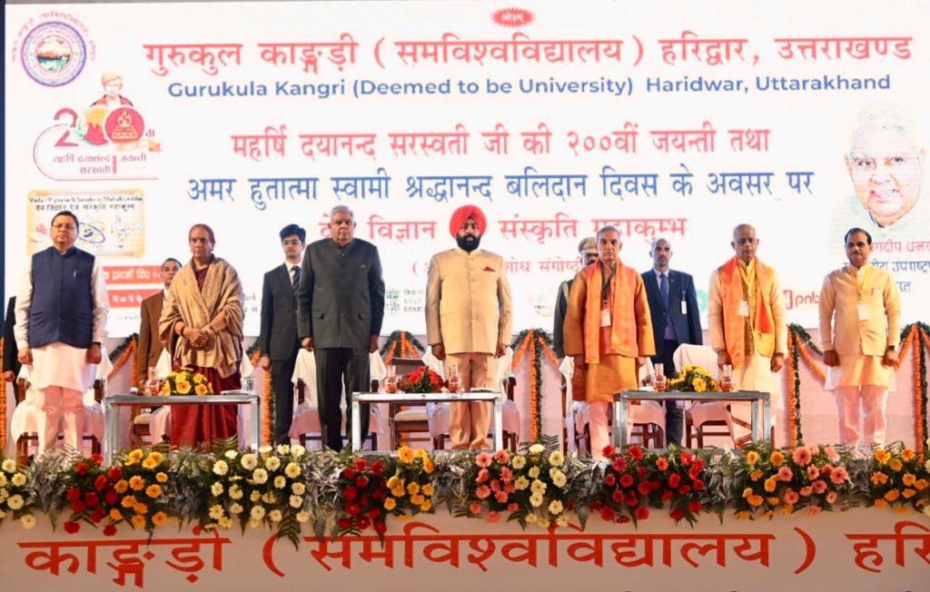 हरिद्वार/ देहरादून 23 दिसंबर, न्यूज यूके लाइव डॉट इन। उपराष्ट्रपति जगदीप धनखड़, डॉ. (श्रीमती) सुदेश धनखड़ के साथ आज अपने एकदिवसीय दौरे पर हरिद्वार पहुंचे और वहां गुरुकुल कांगड़ी विश्वविद्यालय द्वारा आयोजित किये जा रहे वेद विज्ञान एवं संस्कृति महाकुंभ के उद्घाटन समारोह को मुख्य अतिथि के रूप में संबोधित किया। गुरुकुल कांगड़ी द्वारा इस महाकुंभ का आयोजन स्वामी दयानंद सरस्वती की 200वीं जयंती और स्वामी श्रद्धानंद के बलिदान दिवस में अवसर पर किया जा रहा है।