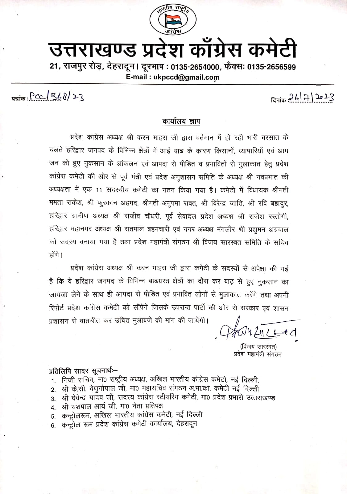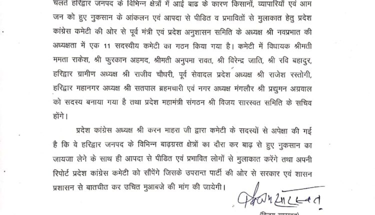 प्रदेश महामंत्री संगठन विजय सारस्वत ने यह भी बताया कि प्रदेश कांग्रेस अध्यक्ष श्री करन माहरा जी द्वारा कमेटी के सदस्यों से अपेक्षा की गई है कि वे हरिद्वार जनपद के विभिन्न बाढ़ग्रस्त क्षेत्रों का दौरा कर बाढ़ से हुए नुकसान का जायजा लेने के साथ ही आपदा से पीडित एवं प्रभावित लोगों से मुलाकात करेंगे तथा अपनी रिपोर्ट प्रदेश कांग्रेस कमेटी को सौंपेंगे जिसके उपरान्त पार्टी की ओर से सरकार एवं शासन प्रशासन से बातचीत कर किसानों एवं व्यापारियों को हुए नुकसान के लिए उचित मुआबजे की मांग की जायेगी।