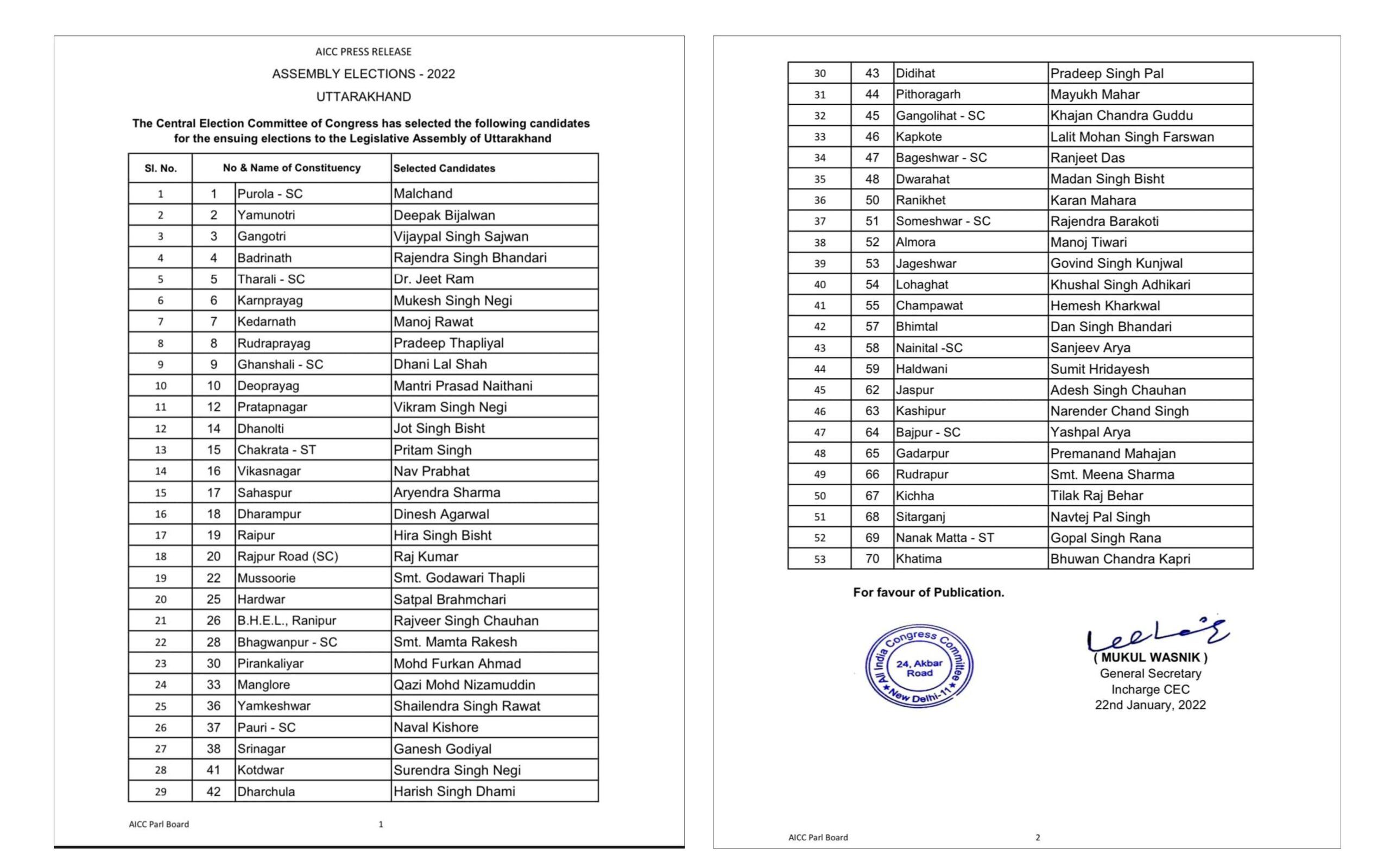 उत्तराखंड कांग्रेस की पहली लिस्ट जारी,लिस्ट से हरदा का नाम गायब ,क्या चुनाव लड़ेंगे हरदा!