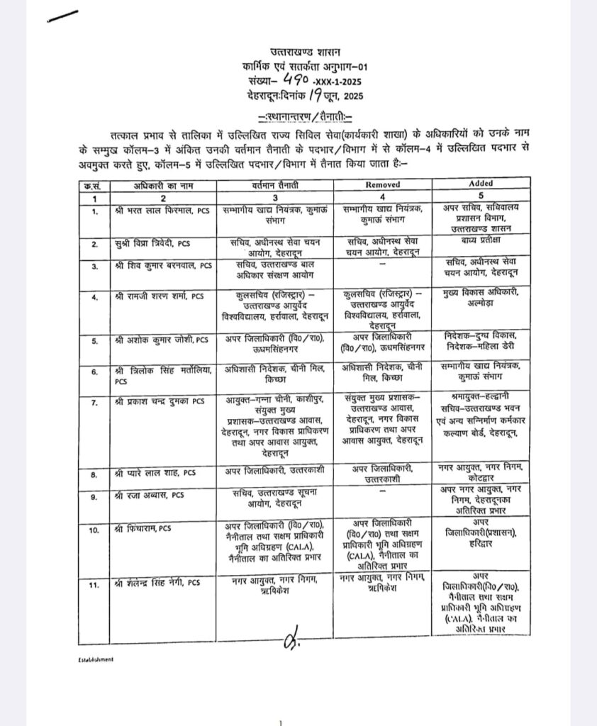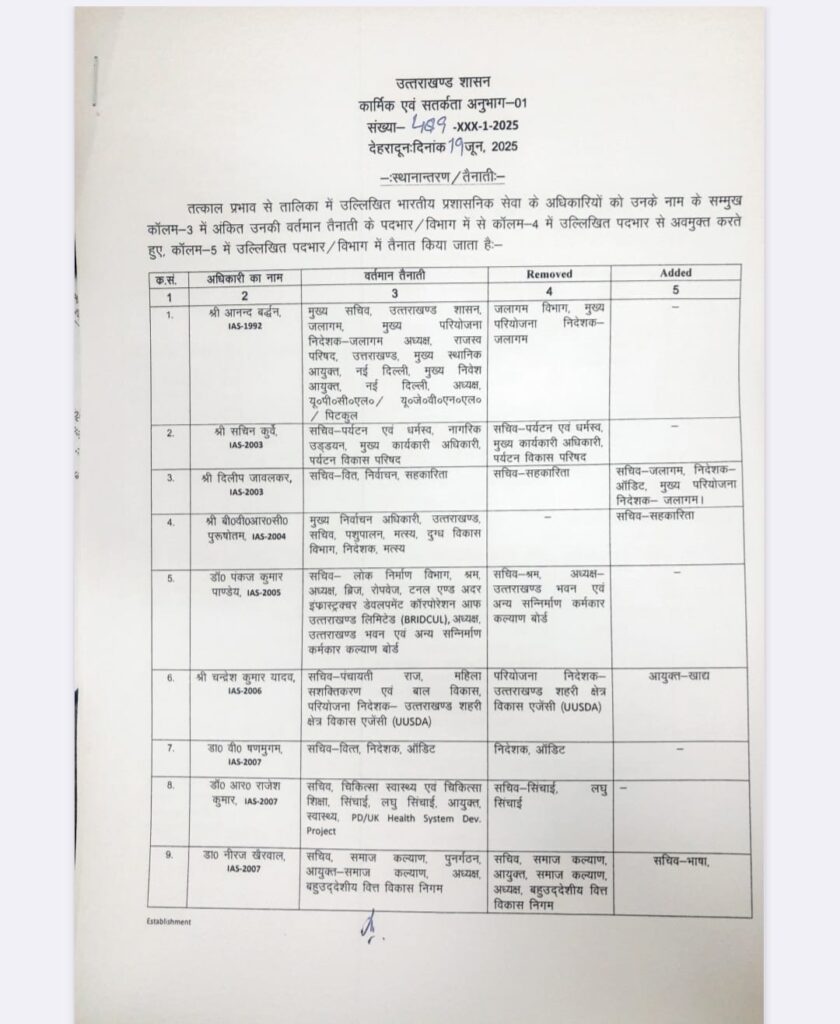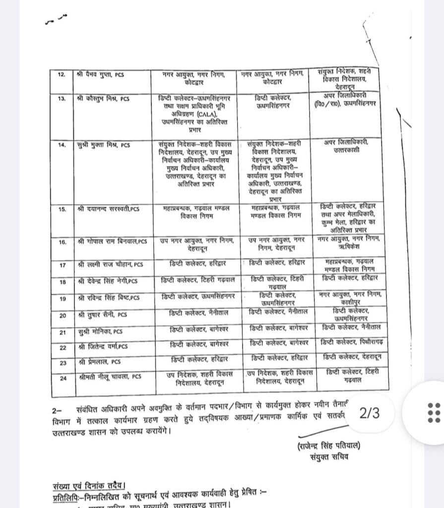 उत्तराखंड: IAS-PCS अधिकारियों के दायित्वों में किया गया फेरबदल By newsadmin On Jun 20, 2025 देहरादून, न्यूज यूके लाइव डॉट इन। उत्तराखंड में IAS PCS अधिकारियों के दायित्वों में बदलाव किया गया है। देखिए सूची Facebook Twitter LinkedIn WhatsApp