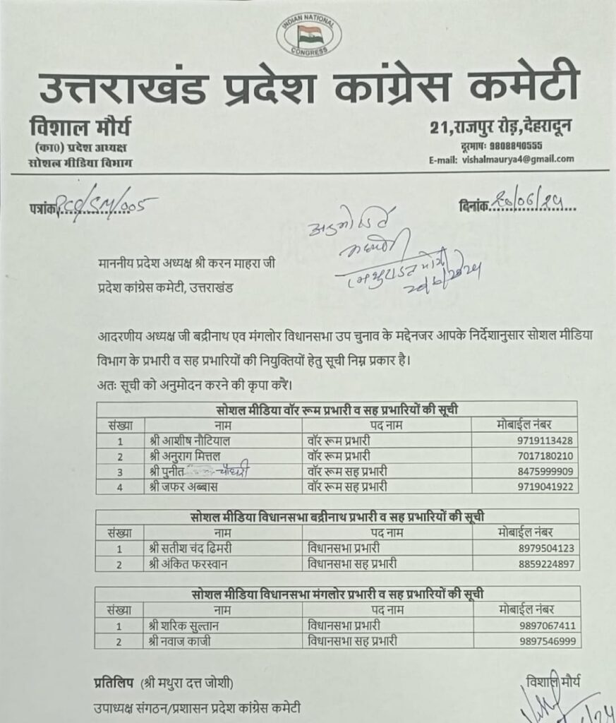 देहरादून, न्यूज यूके लाइव डॉट इन। बद्रीनाथ एवं मंगलौर विधानसभा उपचुनाव हेतु प्रदेश कांग्रेस सोशल मीडिया विभाग द्वारा प्रदेश स्तरीय वार रूम एवं विधानसभा क्षेत्रवार वाररूम प्रभारी एवं सहप्रभारियों की नियुक्ति की गई है।