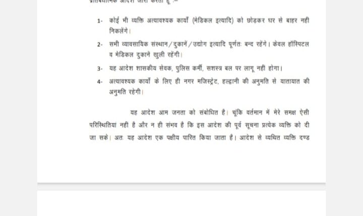 4- अत्यावश्यक कार्यों के लिए ही नगर मजिस्ट्रेट, हल्द्वानी की अनुमति से यातायात की अनुमति रहेगी।