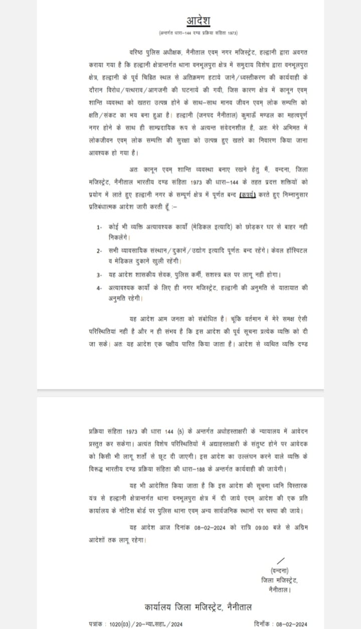कानून एवम् शान्ति व्यवस्था बनाए रखने हेतु जिला मजिस्ट्रेट, वंदना सिंह ने भारतीय दण्ड संहिता 1973 की धारा-144 के तहत प्रदत्त शक्तियों को प्रयोग में लाते हुए हल्द्वानी नगर के सम्पूर्ण क्षेत्र में पूर्णतः बन्द (कर्फ्यू) के आदेश आज रात्रि 09 बजे से अग्रिम आदेशों तक लागू कर दिए है। इसके साथ ही निम्नानुसार प्रतिबंधात्मक आदेश भी जारी किए है