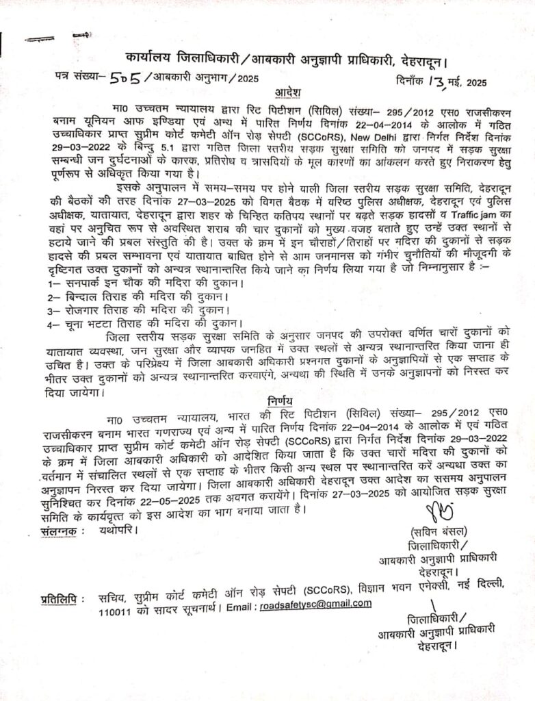 डीएम की अध्यक्षता में 27 मार्च को आयोजित सड़क सुरक्षा समिति की बैठक वरिष्ठ पुलिस अधीक्षक, पुलिस अधीक्षक यातायात द्वारा शहर में बढते सड़का हादसों व यातायात जाम के 04 स्थानों पर शराब की दुकानों को मुख्य वजह बताते हुए इन स्थानों सनपार्क इन चौक, बिन्दाल तिराहा, रोजगार तिराहा, चूना भट्टा स्थित मदिरा से जनसुरक्षा के दृष्टिगत शराब की दुकानों का हटाने की प्रबल संस्तुति की गई थी। पुलिस के प्रस्ताव पर जनसुरक्षा के लिए खतरा तथा यातायात में बाधक बन रही शराब की दुकानों को 01 सप्ताह के भीतर स्थान्तरित करने के डीएम ने आदेश जारी कर दिए हैं।
